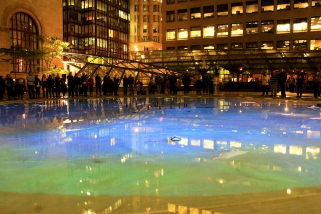 Liquid Cohesion is a large scale projection piece premièred at Commerce Court, Toronto during Nuit Blanche. The piece consists of a 40′ projection onto the surface of a large pool in the centre of the courtyard. A performer walks through the pool and interacts with the projections through the use of video motion tracking.